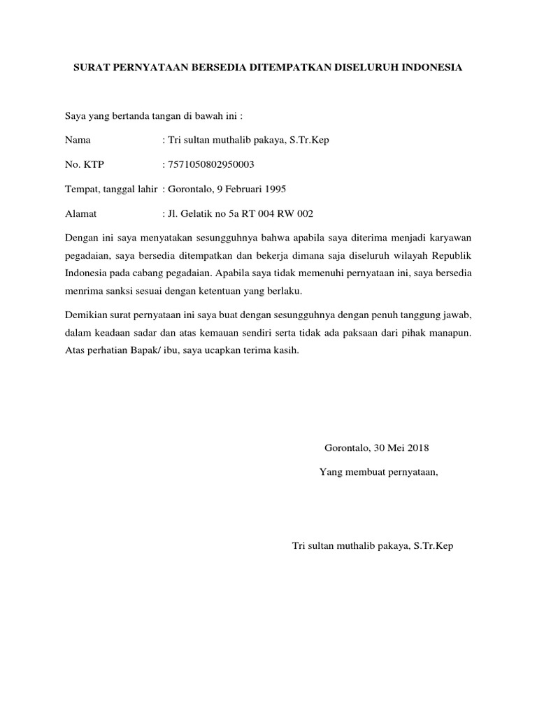Untuk contoh format surat pernyataan bermaterai, surat keterangan, surat permohonan, surat lamaran, surat penawaran, dan surat menyurat lainnya. Lazimnya, surat pernyataan ditulis seseorang jika dirinya berhalangan menyelesaikan suatu tugas atau terkendala menghadiri sebuah kegiatan. Contoh surat pernyataan ( bersedia tidak pindah ). Sebab kebutuhan pegawai di setiap daerah itu beragam, bisa saja anda yang berasal dari wilayah jawa tengah di tempatkan di kalimantan atau wilayah lain di indonesia. Bersedia untuk menjalani masa pelatihan selama 3 bulan. Selain itu, ada juga pengertian lain. Naskah karya peroranga mas agus. .tahun 2012, saya bersedia ditempatkan dan bekerja di mana saja di seluruh wilayah republik indonesia pada unit pelayanan teknis (upt) milik apabila saya tidak memenuhi pernyataan ini, saya bersedia diberhentikan dengan tidak hormat sebagai calon pegawai negeri sipil/pegawai. Suarat pernyataan ditempatkan dimana saja. By indoamaterasu post a comment. Sanggup di tempatkan di cabang perusahaan id seluruh indonesia. Contoh surat pernyataan adalah surat yang digunakan untuk menyatakan sesuatu kepada penerima. Identitas yang bersangkutan calon karyawan (pelamar kerja) 2.